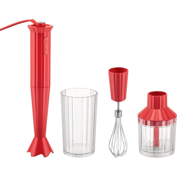 Denna stavmixer är den perfekta kombinationen av design och funktionalitet. Den är designad av Michele De Lucchi som snabbt blev populär på grund av den unika formen. I detta set får du en minihackare, mixbehållare och en visp som enkelt kan användas med stavmixern. Stavmixern är enkel att rengöra, mixbehållaren och behållaren till minihackaren kan rengöras i diskmaskinen vid en temperatur på 60 grader.