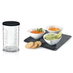 Den medföljande minihackaren gör att du smidigt kan hacka livsmedel som nötter, örter och choklad. Mixerbägaren är utrustad med måttangivelser, så att du kan mäta upp och mixa direkt i koppen. Du kan även förvara det du mixat, till exempel i kylen, tack vare det medföljande locket. Både minihackaren och mixerbägaren tål maskindisk, så att du är klar med både tillagning och disk på nolltid.