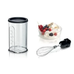 Med hjälp av den praktiska minihackaren kan du smidigt finhacka råvaror som lök, nötter, örter och choklad. Ballongvispen kan du använda för att vispa upp grädde eller äggvita till läckra efterrätter. I mixerbägaren kan du både mäta upp, mixa och sedan förvara tack vare det medföljande locket. Både minihackare och mixerbägare tål maskindisk, så att du kan rengöra dem på nolltid.