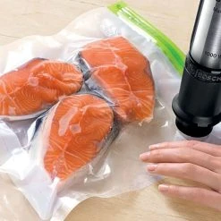 Att använda vakuumförvaring är ett enkelt sätt att hålla maten fräsch längre. Med de specialdesignade vakuumlådorna och ziplockpåsarna har det aldrig varit enklare. Allt du behöver göra är att montera vakuumpumpen på stavmixern, suga ut luften och njuta av välbevarade råvaror. Matlådan är tillverkad av BPA-fri Tritan som tål mikrovågsugn och maskindisk. Vakuumpåsarna är tillverkade av flera lager BPA-fri plast, har dubbelt blixtlås och tål att frysas. Påsarna är dessutom återanvändbara och kan diskas under rinnande vatten eller i diskmaskin.