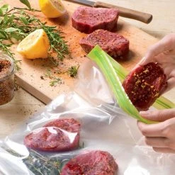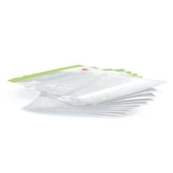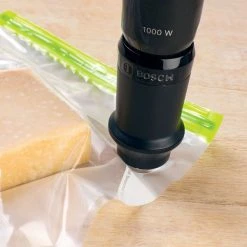 Med hjälp av vakuumpåsar kan du enkelt hålla maten fräsch längre. I det här setet ingår 10 zip-påsar som rymmer cirka 3,8 liter. Påsarna är kompatibla med Bosch-produkter med vakuumfunktion. De är tillverkade av BPA-fri plast i flera lager, har dubbla blixtlås och tål att förvaras i fryser. Du kan använda varje påse flera gånger och diska påsarna antingen under rinnande vatten eller i diskmaskin.