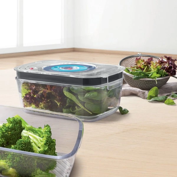 Vill du förlänga hållbarheten på dina matvaror? Satsa på vakuumförvaring från Bosch. I det här setet ingår två förvaringslådor med vakuumförslutning, specialtillverkade för Bosch-produkter med vakuumfunktion. Lådorna är tillverkade av slitstark Tritan-plast, där alla delar som kommer i kontakt med maten är BPA-fria. Lådorna rymmer 1,2 liter.