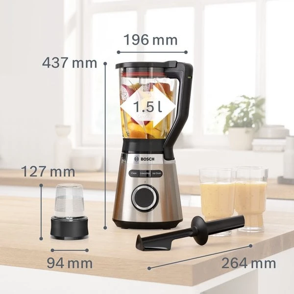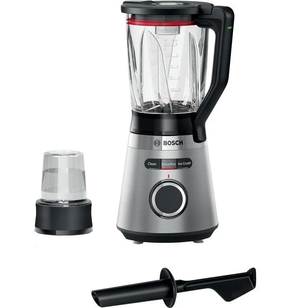 Bosch VitaPower Serie 4 Àr en kraftfull blender som hjÀlper dig att lyckas i köket. Den har en kraftfull motor pÄ 1200 watt, som kommer vÀl till pass oavsett om du vill krossa is, blanda en smoothie, mixa soppa eller göra egen pesto. Du kan enkelt vÀlja manuellt mellan olika instÀllningar och blendern har Àven tre smarta förinstÀllda program för smoothies, krossad is och rengöring av kannan.