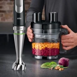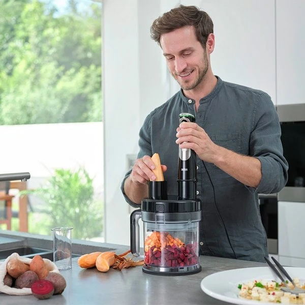 Denna Braun MQ9195XL stavmixer ger dig möjligheten att klara av alla uppgifter i köket. Med sin högteknologiska ActiveBlade Technology fÄr du upp till 60% bÀttre prestanda som ger ett finare och bÀttre resultat. Du kan vÀlja mellan 3 olika hastigheter som bestÄr av plus, lÄg och hög. Dessutom har den en av de kraftigaste motorerna pÄ 1200 watt, det finns alltsÄ inget som motstÄr dess prestanda. Stavmixern Àr utrustad med SplashControl som ser till att köket hÄlls rent.