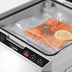 VacuChef 40 har en strak professionell vakuumpump (70 liter/min), och den har dubbelsvetstråd till påsar på upp till 25 cm. Den integrerade låsmekanismen ser till så att vakuumpåsen blir som den ska. Maskinen har olika program för olika matvaror, och du väljer dem enkelt via den enkla kontrollpanelen. Vakuumpackaren är tillverkad av rostfritt stål med glaslager. Med maskinen ingår en vakuumslang och 20 vakuumpåsar (25×28 cm.).