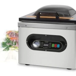 NÀr man vakuumpackar mat kommer den ocksÄ hÄlla sig fÀrsk upp till Ätta gÄnger sÄ lÄng tid. VacuChef 77 Àr gjord för pÄsar med en bredd pÄ 30 cm. och den har en strak, professionell vakuumpump (77 liter/min). Vakuumpackaren Àr tillverkad av rostfritt stÄl och har ett transparent lock av plexiglas. Följ med i processen och justera tiden med hjÀlp av den digitala displayen.