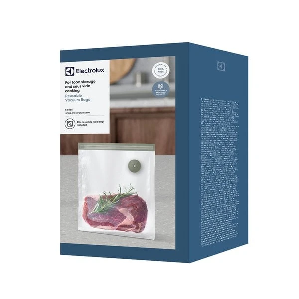 Återanvändningsbara vakuumpåsar till förvaring av mat och sous vide. Påsen håller maten färsk och bevarar smaken längre. Den förseglade påsen ser till att råvarorna inte tappar fukt och smak, näringsämnen och konsistens bevaras. Påsarna kan användas i mikrovågsugnen, frysen och kylskåpet. Påsarna är BPA-fria och godkända till förvaring av matvaror. I detta paket får du 20 st. återanvändningsbara påsar som kan rengöras i diskmaskin. Påsarna har måtten 23×26 cm.
