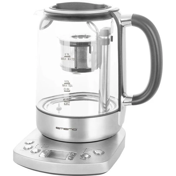 Lyxig sladdlös vatten- och tekokare frÄn Emerio som bÄde ger dig kokande vatten pÄ nolltid och brygger ditt te till perfekt styrka. Vattenkokaren har en stilren transparent design med tydliga markeringar för vattennivÄ. Lock och handtag Àr tillverkade av vÀrmetÄlig plast, kannan av glas och bottendelen samt teinsatsen av rostfritt stÄl.