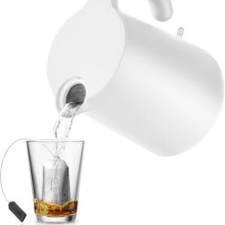 Vattenkokaren stÄr elegant pÄ köksbÀnken och tar upp relativt lite utrymme tack vare den kompakta designen. VÀrmeelementet Àr dolt och filtret gÄr at ta ur, vilket gör rengöring och avkalkning bra mycket lÀttare. DÀrtill Àr vattenkokaren utrustad med ett lÀttlÀst vattenmÄtt och finns i fÀrgerna svart och vitt.