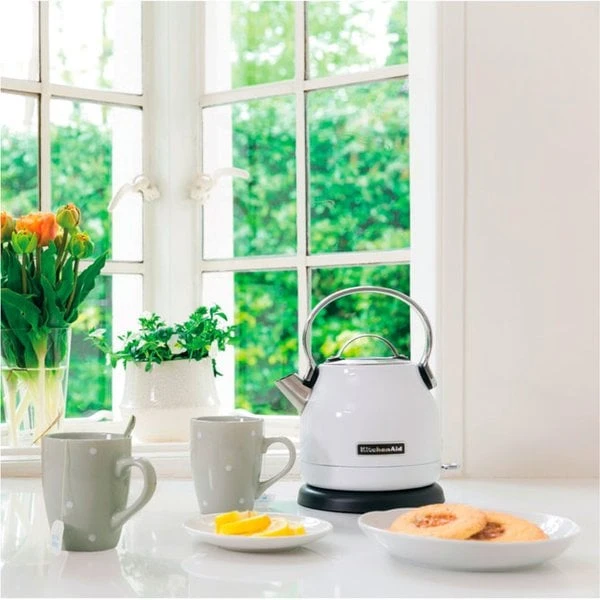 En lÀttanvÀnd och utseendemÀssigt underbar cremefÀrgad vattenkokare. Den kokar vatten pÄ ett effektivt, tids- och energisparande sÀtt. Vattenkokaren sitter pÄ en plattform och kan roteras 360°. En indikator visar tydligt nÀr vattnet kokar.
