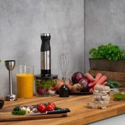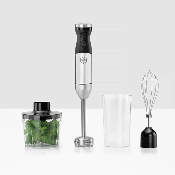 Mixerns ergonomiska handtag Àr speciellt designat för att underlÀtta mixningen och ge dig ett stabilt grepp. Utöver sjÀlva stavmixern ingÄr Àven en stÀnkfri mixerbÀgare som rymmer 700 milliliter, en minihackare som rymmer 500 milliliter och en ballongvisp. Du fÄr alltsÄ flera smarta tillbehör som underlÀttar mÄnga projekt i köket. SkötselrÄd: Rengör motorenheten med fuktig trasa. Diska skaft och blad för hand. Den medföljande plastbÀgaren kan diskas i diskmaskin.