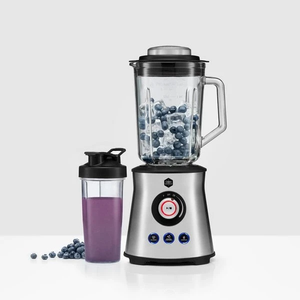 Med blendern Master Steel+ frĂ„n OBH Nordica fĂ„r du det bĂ€sta av tvĂ„ vĂ€rldar â en stor glaskanna för större satser och krossad is, och en praktisk take away-flaska dĂ€r du kan mixa smoothien direkt och ta med till jobbet. Blendern har en klassisk och tidlös design som passar i de flesta kök. Den har en kraftfull motor pĂ„ 1000 watt och 6 blad med titanbelĂ€ggning som hĂ„ller skĂ€rpan lĂ€nge och krossar is pĂ„ bara nĂ„gra sekunder. TvĂ„ kannor medföljer, en större glaskanna och en take away-flaska i BPA-fri plast vilket passar bra för smoothies och barnmat.