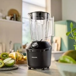Mixern Àr enkel och bekvÀm att anvÀnda tack vare den ergonomiska designen. Den vÄgformade nederdelen förhindrar stÀnk och spill och knivdelen kopplas enkelt loss för diskning via en knapp. MixerbÀgare medföljer.