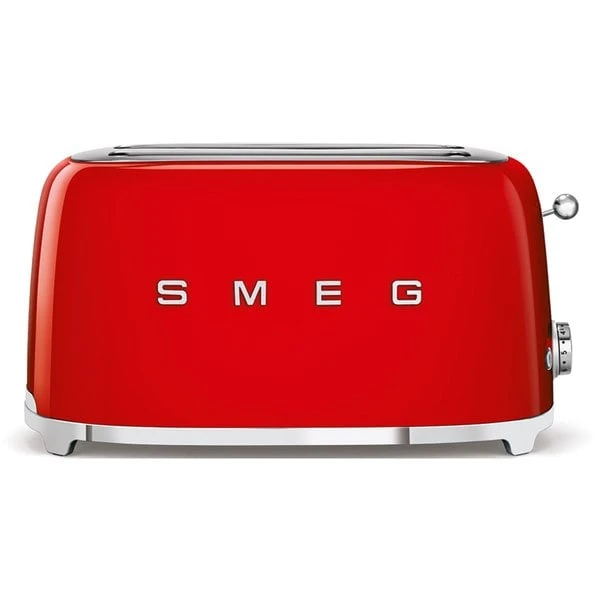 Röd brödrost i härlig femtiotalsstil från det populära varumärket Smeg. Rosten är tillverkad av lackerad stålplåt.