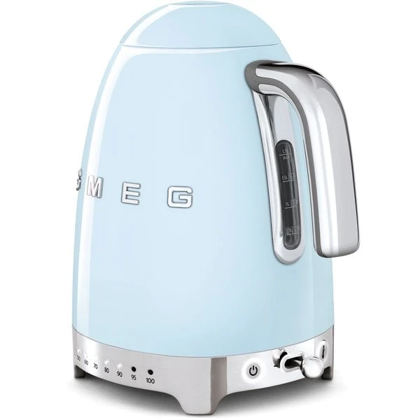 En 50-talsinspirerad pastellblå vattenkokare från italienska Smeg. Vattenkokaren är en del av en rad köksmaskiner från Smeg i samma anda. Funktionen hos vattenkokaren håller jämna steg med utseendet i världsklass.