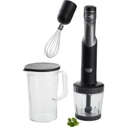 SM-1000FP-stavmixerpaket frĂ„n Wilfa Ă€r en allt-i-ett-produkt. HĂ€r fĂ„r du nĂ€mligen hela tre köksmaskiner i ett dĂ„ stavmixern levereras med minihackare, visp och mĂ„ttkanna med lock. Den traditionella stavmixern har en kraftig motor som gör den perfekt till soppor, hummus och liknande, medan minihackaren Ă€r som gjord för att hacka nötter till en hemmagjord mĂŒsli. Med vispen kan du enkelt blanda till en luftig marĂ€ng-visp eller grĂ€dde och som pricken över i:et tĂ„l samtliga delar maskindisk.
