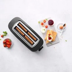 Säkerhetsfunktion med automatisk avstängning förhindrar att brödet bränns. Den integrerade kabelupprullaren gör det enkelt och smidigt att förvara brödrosten där du vill.