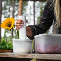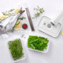 Genom att vakuumförpacka mat förvaras den på ett praktiskt sätt som gör att vitaminer samt näringsämnen bibehålls. De medföljande behållarna är tillverkade av BPA-fri plast och tål maskindisk, mikrovågsugn, kylskåp och frys. Kom ihåg att det behöver finnas luft i behållarna för att skapa vakuum. De smarta påsarna kan även de användas i frys och mikrovågsugn, och de tål värme på upp till 100°C, vilket gör dem perfekta till användning i en Sous Vide. Använd den smarta Zwilling Culinary World-appen och skanna QR-koden på locken samt påsarna för att hålla ett öga på matens hållbarhet.